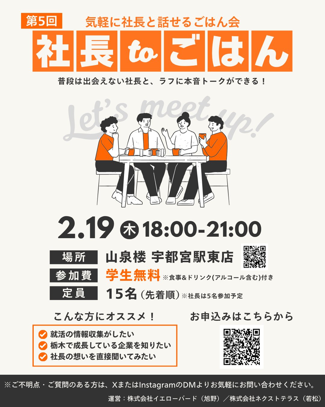 社長toごはん 第5回社長 toごはん 2026.02.21 社長toごはん Post Share Hatena LINE RSS feedly Pin it note 社長 to 忘年会前の記事 第6回社長toごはん 小山初開催次の記事
